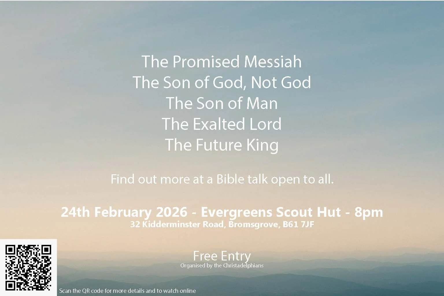 Join us at the Evergreen Scout Hut. 32 Kidderminster Road, Bromsgrove B61 7JF at 8 pm for a presentation on Who Jesus really is. Or watch the video live at the bottom of the page.